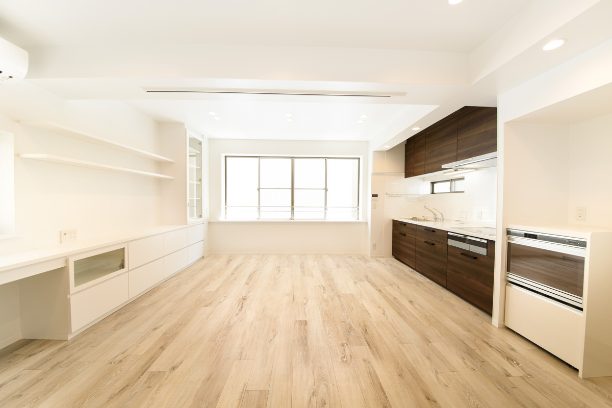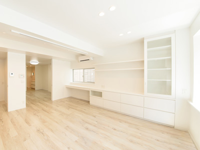 4階建て複合ビル最上階のオーナーズルームの改修。 ご要望はとにかく明るい空間、お持ちの小物たちを飾れる棚。 唯一採光のある南の窓から建物奥まで光が届くように白い空間に大きな建具でひとつながりの空間としました。