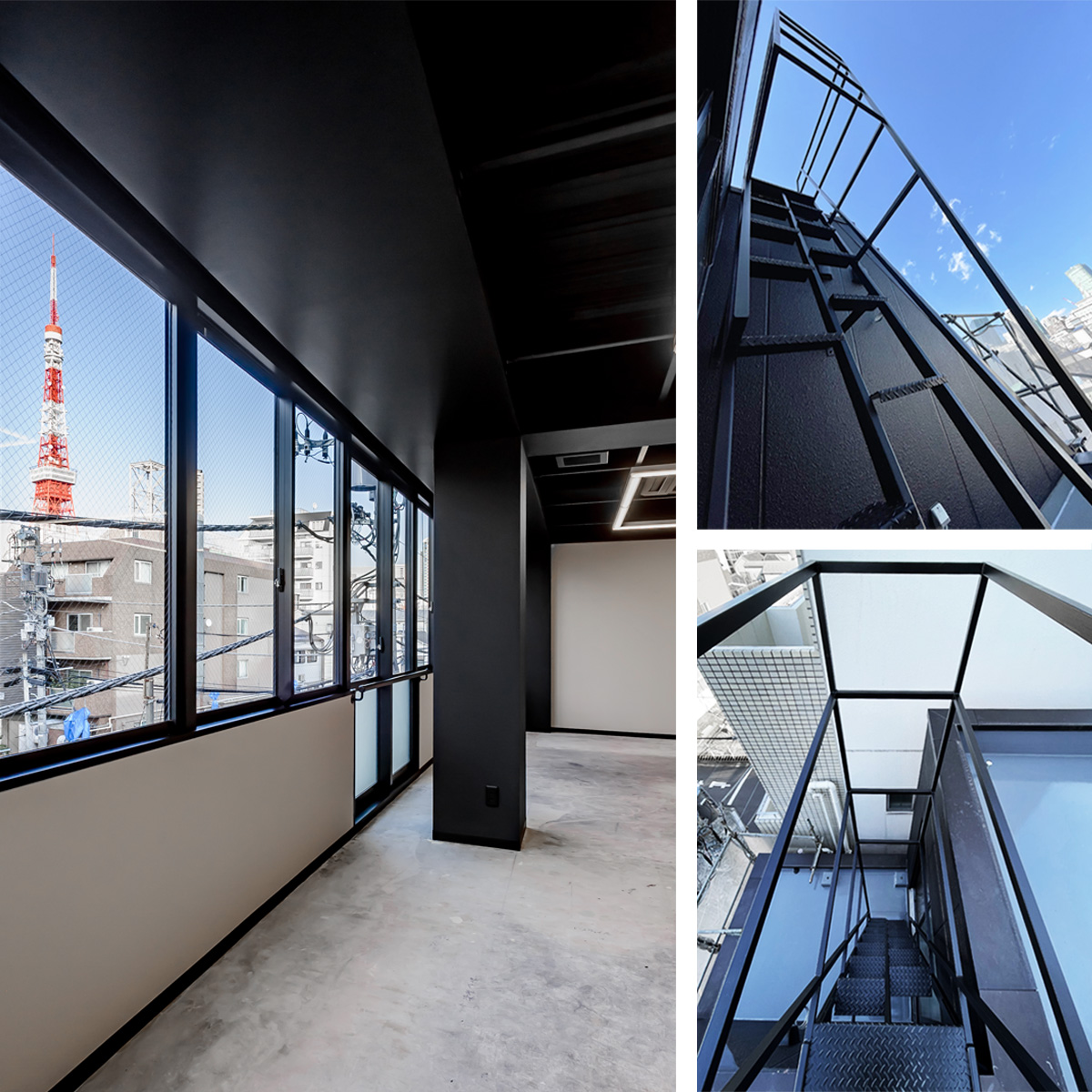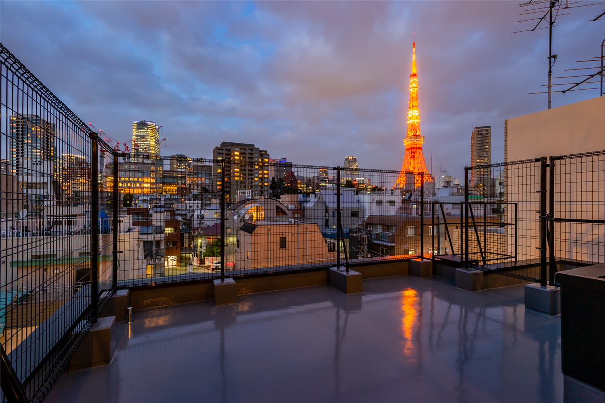 駐車場だった1階部分は増築し店舗に、設備スペースとなってしまっていた屋上へ上がる階段を新設し、東京タワーが一望できる贅沢なルーフバルコニーに。黒とグレーをベースに落ち着いた雰囲気のある空間となりました。
